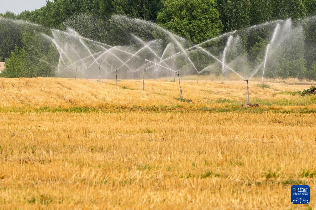 6月20日,肥城市石横镇汇鑫源农民专业合作社流转土地在进行节水喷灌作业。