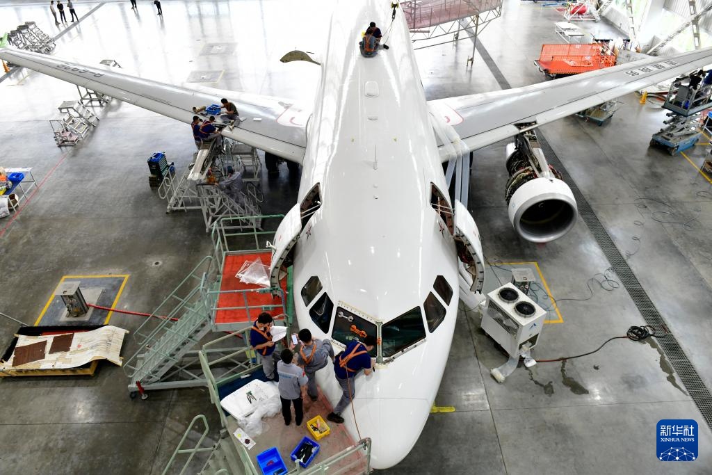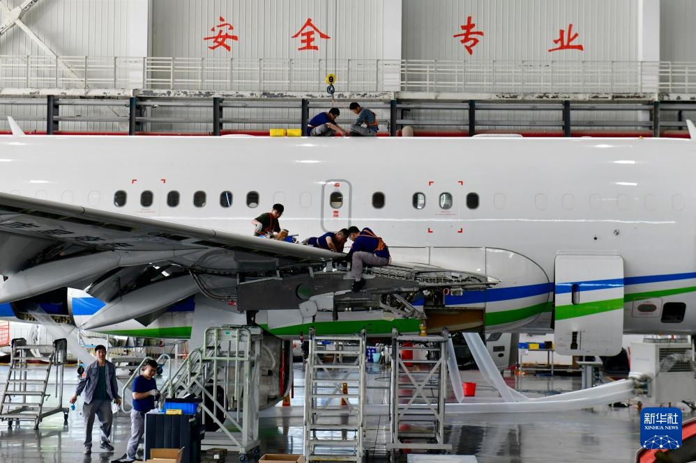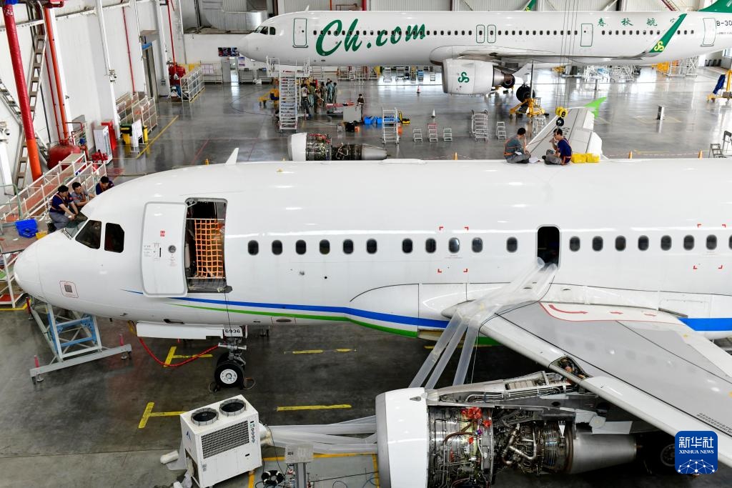 6月20日,在日照市东港区山太飞机维修基地,员工对飞机进行维修。