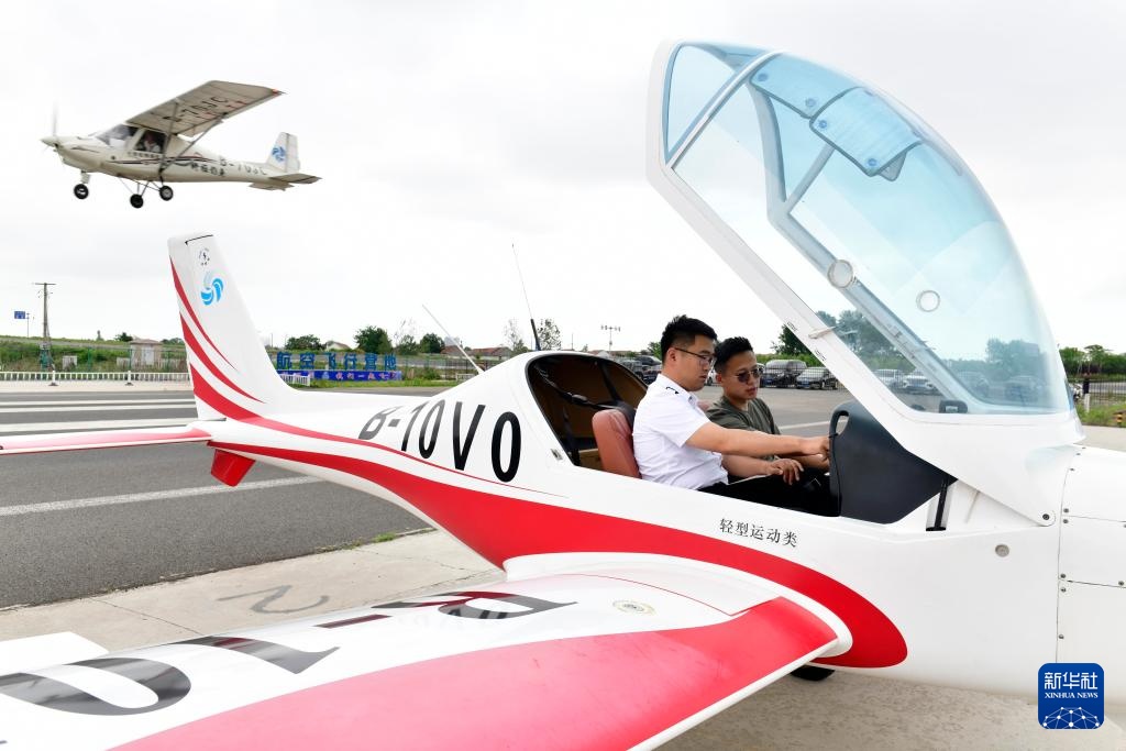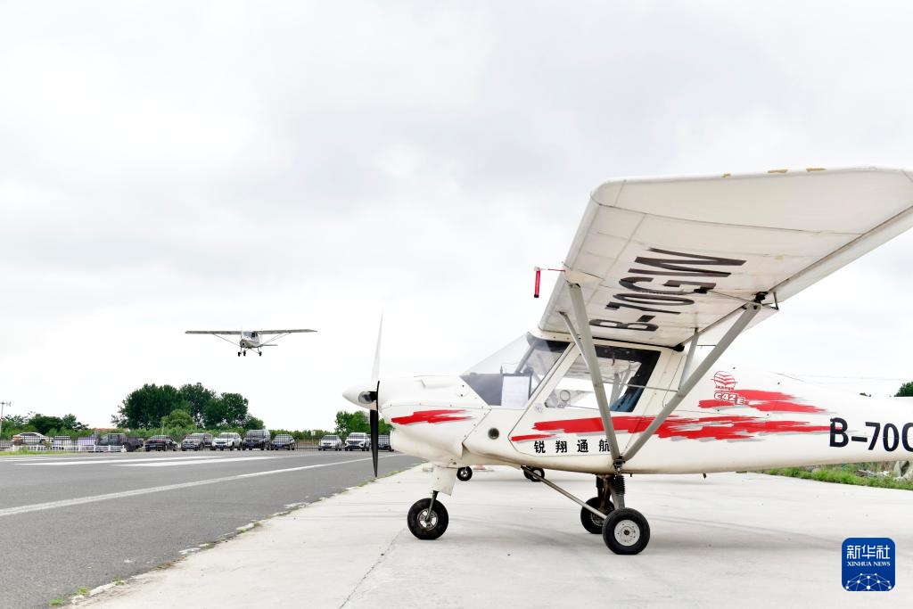 6月20日,在日照市东港区一家通用航空飞行培训基地,一架飞机在飞行培训中。