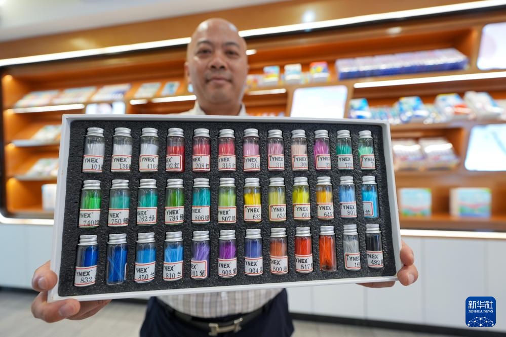 工作人员在扬州市杭集镇三峰刷业有限公司展示各种牙刷刷丝(6月21日摄)。