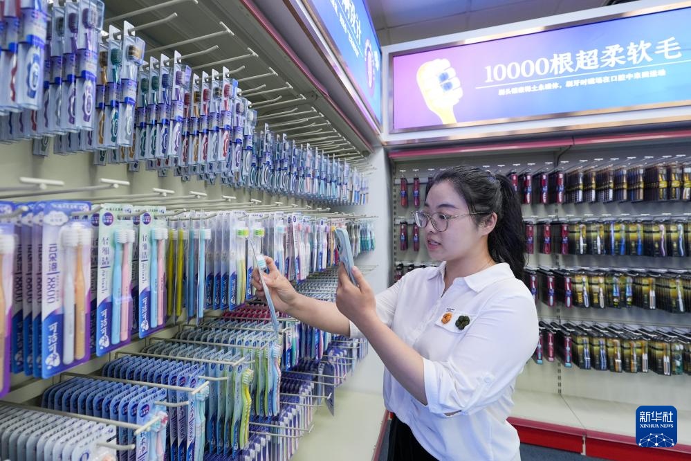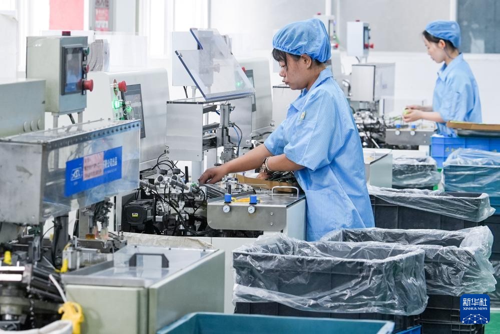 扬州市杭集镇民生刷业日化有限公司工人在牙刷生产线上忙碌(6月20日摄)。