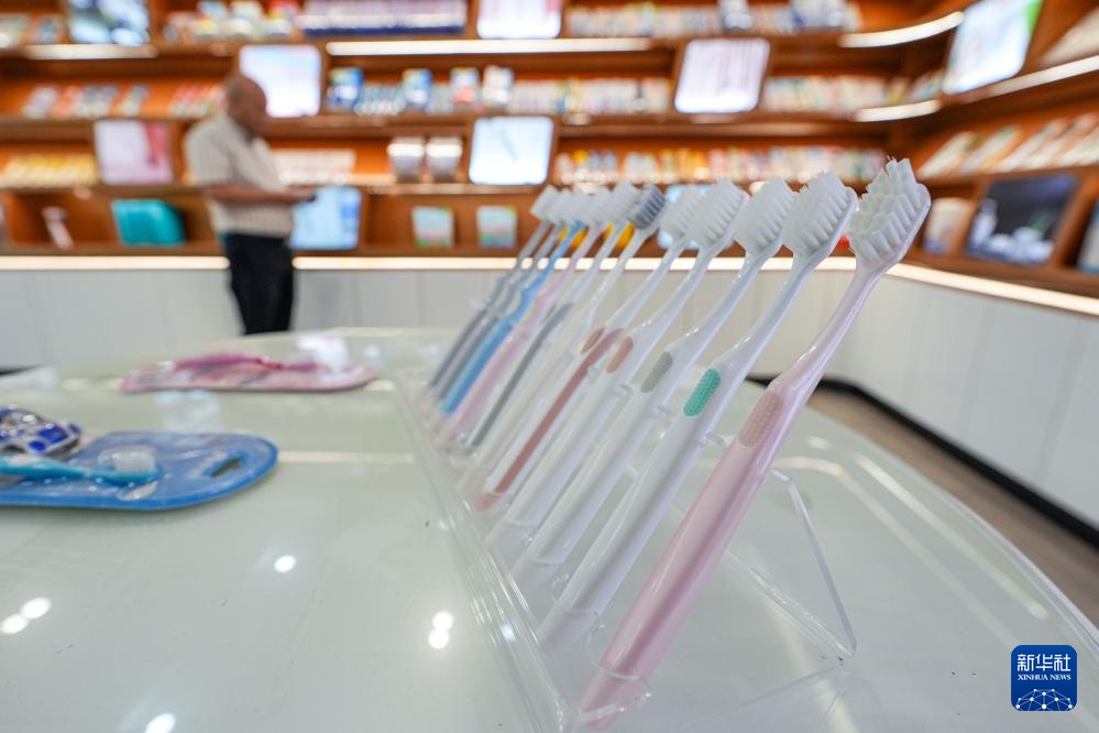 在扬州市杭集镇三峰刷业有限公司展示厅内拍摄的各种牙刷产品(6月21日摄)。