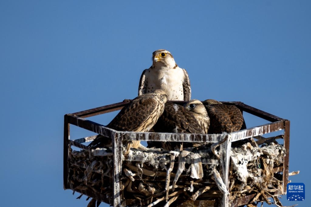 这是在那曲市尼玛县拍摄的养育雏鸟的游隼,它们在“无人区”中林草部门树立的“鹰架”上营巢(6月13日摄)。