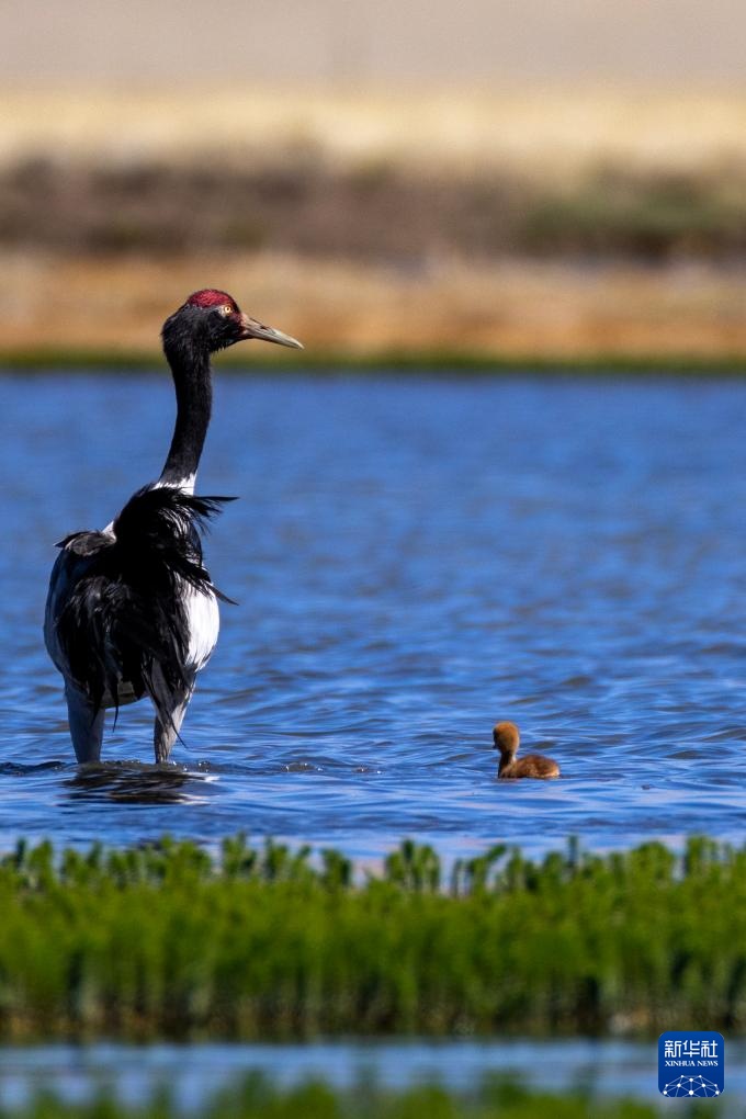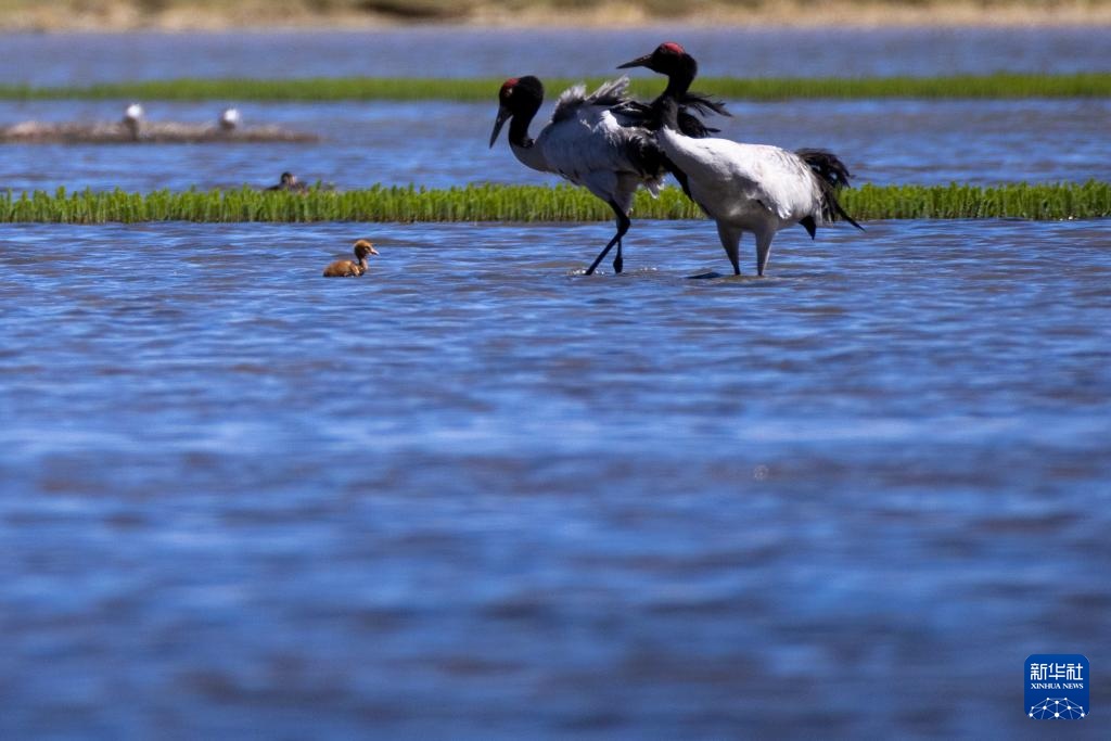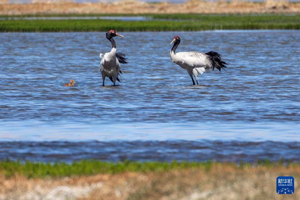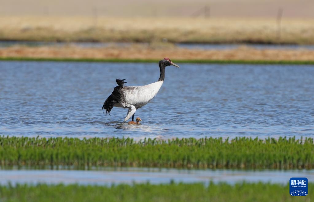 这是在那曲市申扎县拍摄的养育雏鸟的黑颈鹤(6月9日摄)。