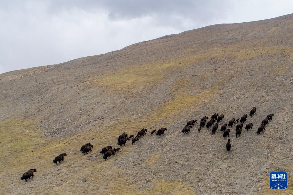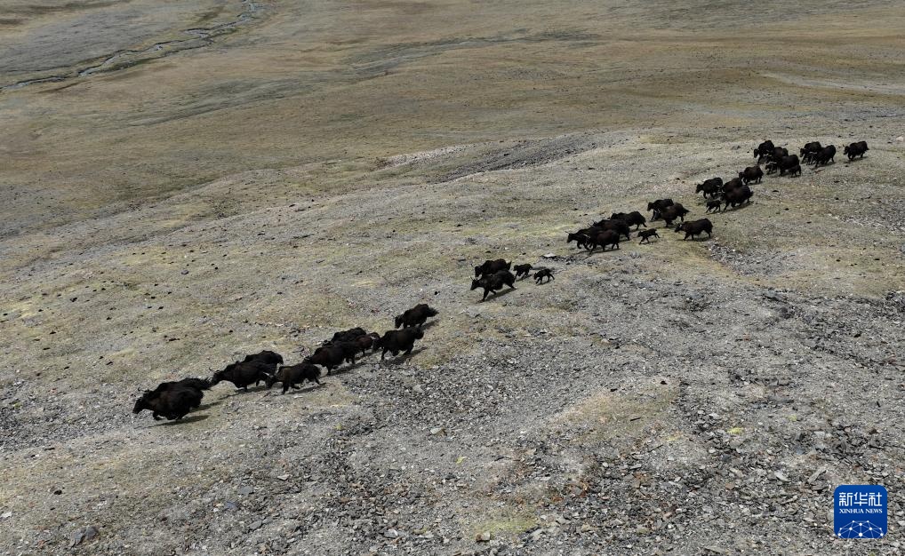 这是在那曲市尼玛县拍摄的野牦牛群,其中有刚出生不久的小牛犊(无人机照片,6月15日摄)。