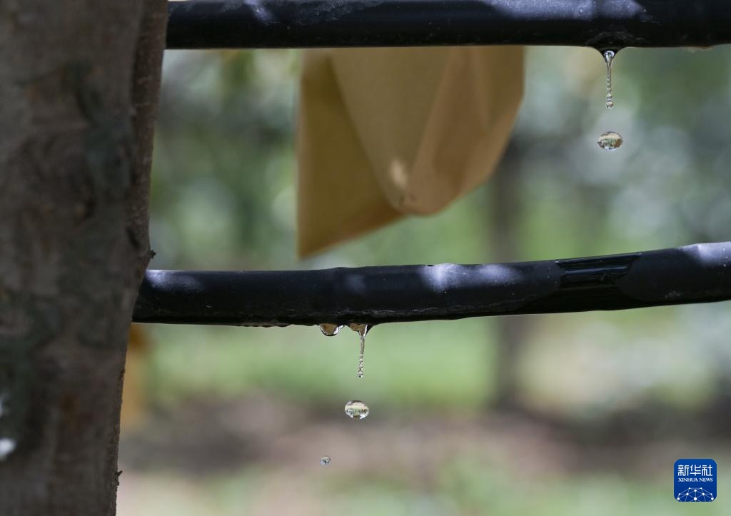 在陕西省延安市洛川县槐柏镇度古村“飞天”苹果基地灌溉示范点,节水滴灌系统为果树灌溉(6月23日摄)。