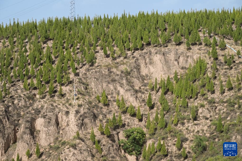 在陕西省榆林市绥德县辛店沟水土保持示范园,人工林在丘壑上扎根成长,成为防止水土流失的重要措施之一(6月25日摄)。