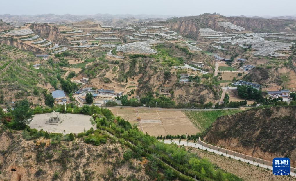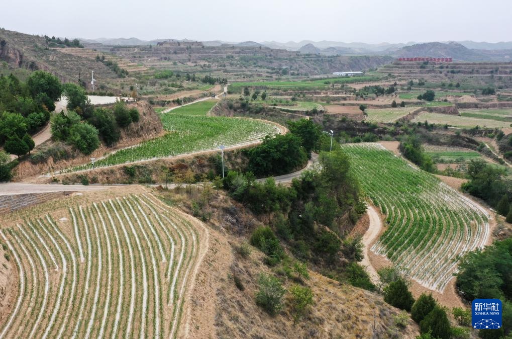 在陕西省榆林市米脂县高西沟水土保持示范园,当地利用梁峁坡地上修水平梯田种植果树(覆盖有冰雹防护网),不仅防止水土流失,还为当地群众实现增收(6月26日摄,无人机照片)。