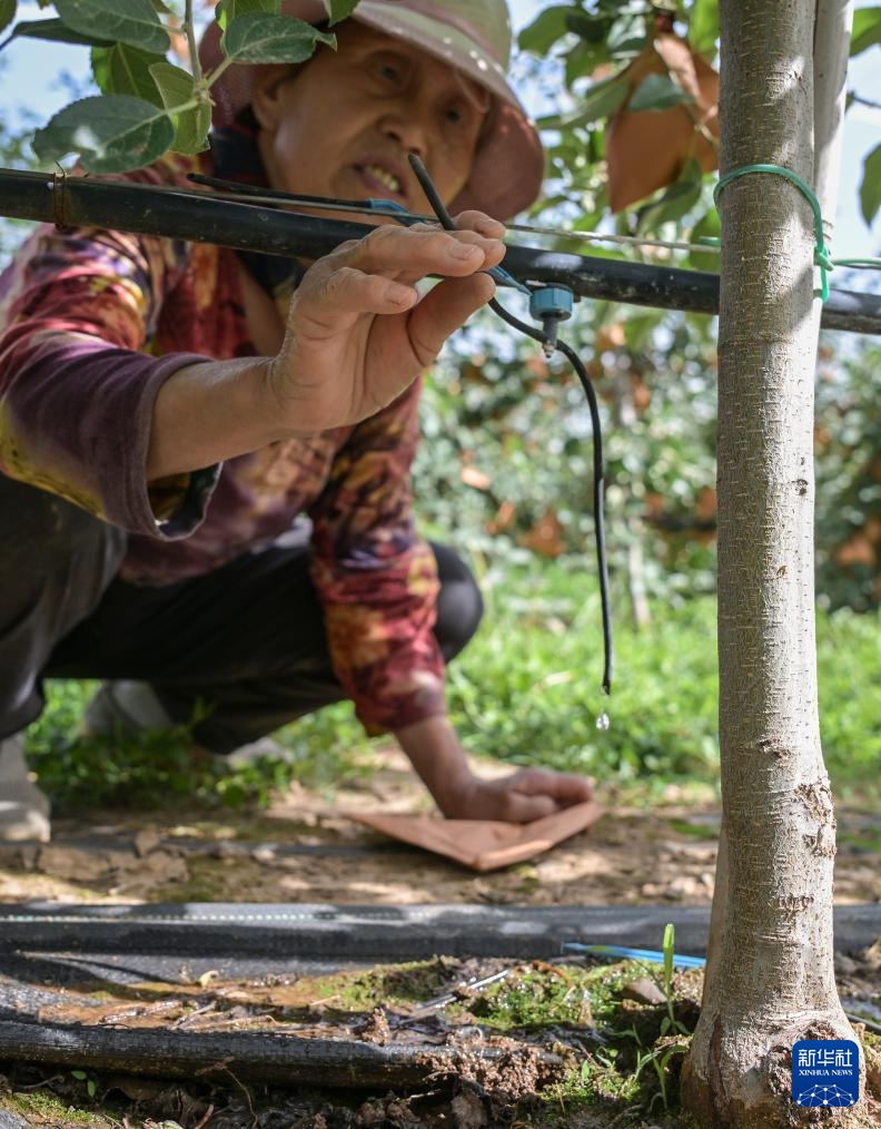 在陕西省延安市洛川县槐柏镇度古村“飞天”苹果基地灌溉示范点,村民在果树下调整滴灌设施(6月23日摄)。