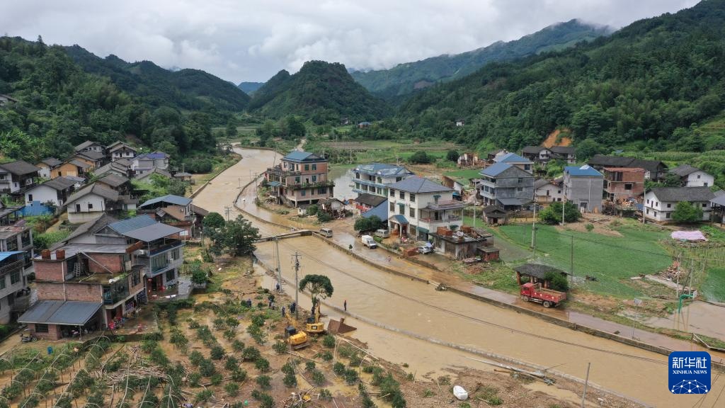 7月2日,在广西柳州市融安县板榄镇泗安村,抢修人员在清理河道。