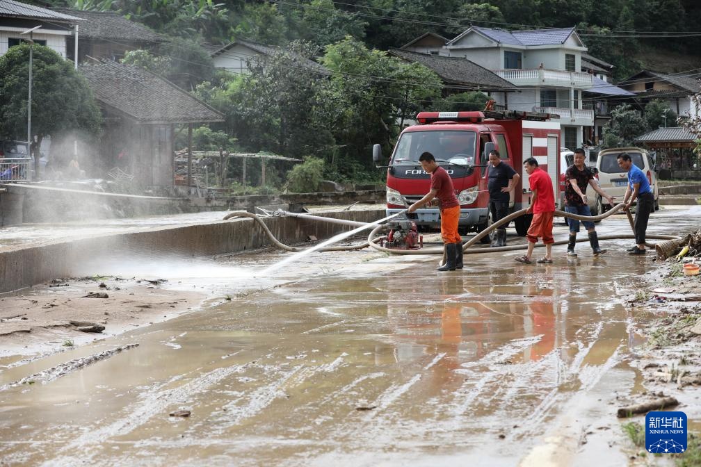 7月2日,在广西柳州市融安县板榄镇泗安村,乡镇专职消防员在冲洗路面。
