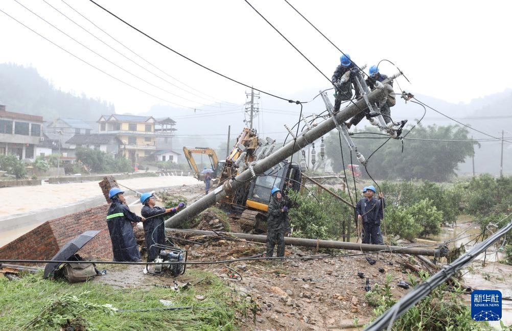 7月2日,在广西柳州市融安县板榄镇泗安村,抢修人员在维修线路。