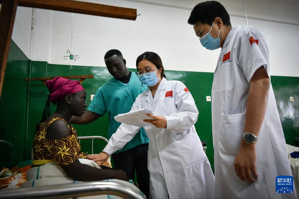 7月8日,在位于几内亚比绍首都比绍的中几比友谊医院,中国医生和当地医护人员一起查房。