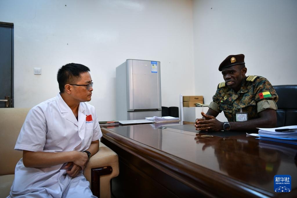 7月8日,在位于几内亚比绍首都比绍的中几比友谊医院,中国援几比医疗队队长庞勇与中几比友谊医院院长拉马略·昆达交流工作。