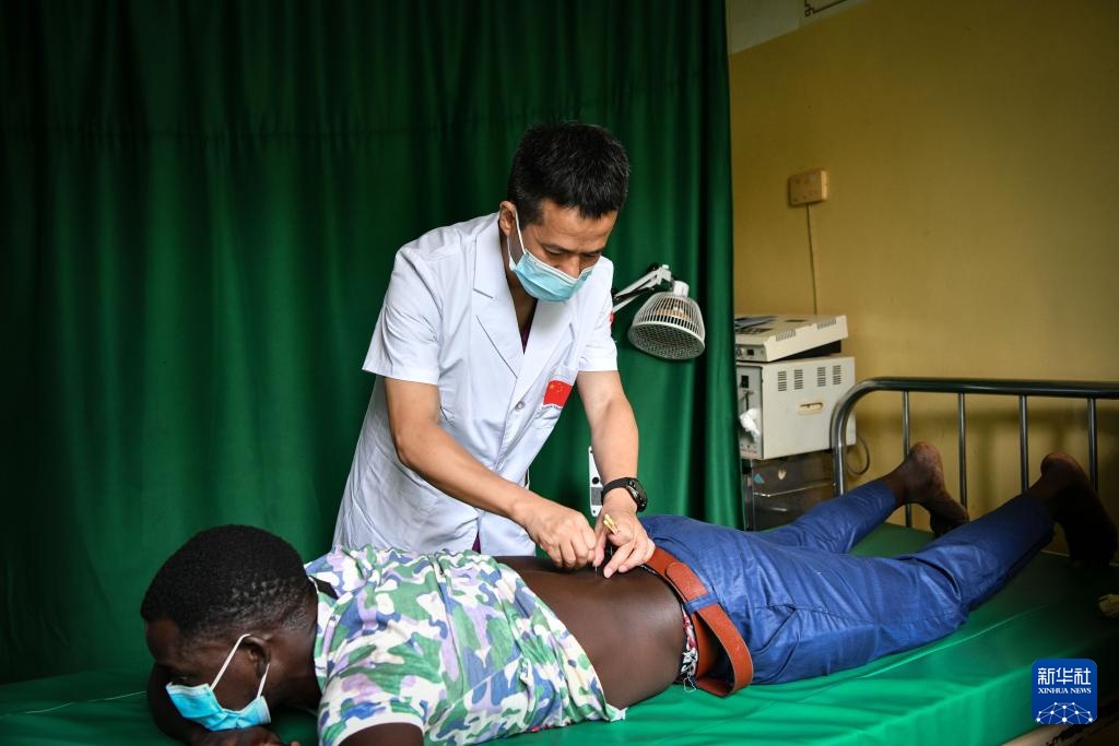 7月8日,在位于几内亚比绍首都比绍的中几比友谊医院,中医科医生陈利章为患者做针灸治疗。