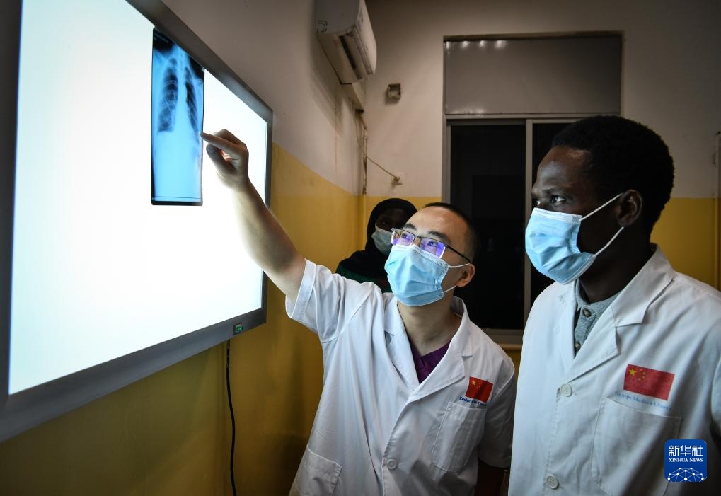 7月8日,在位于几内亚比绍首都比绍的中几比友谊医院,放射科医生孙清泉(中)与当地医生一起阅片。
