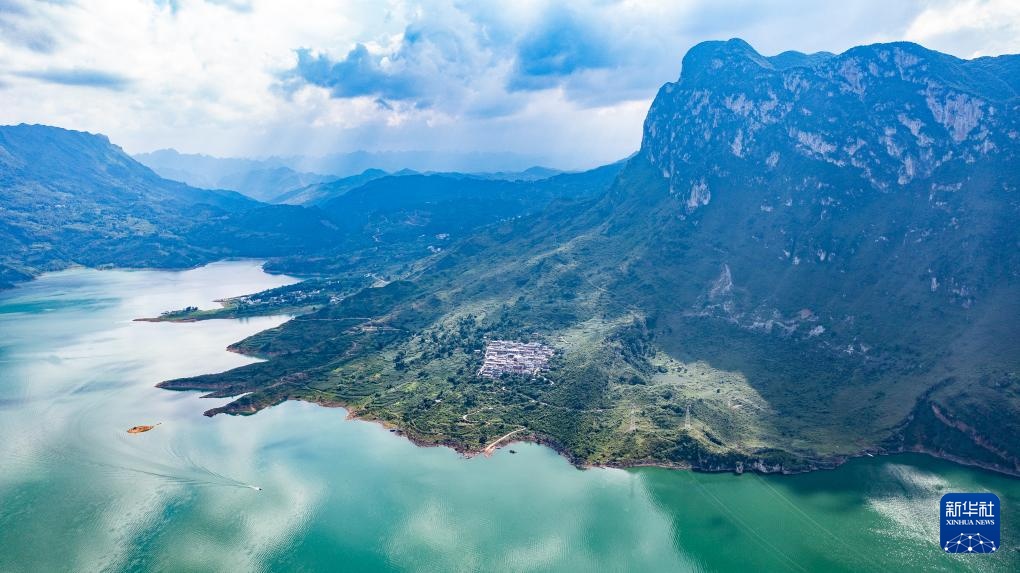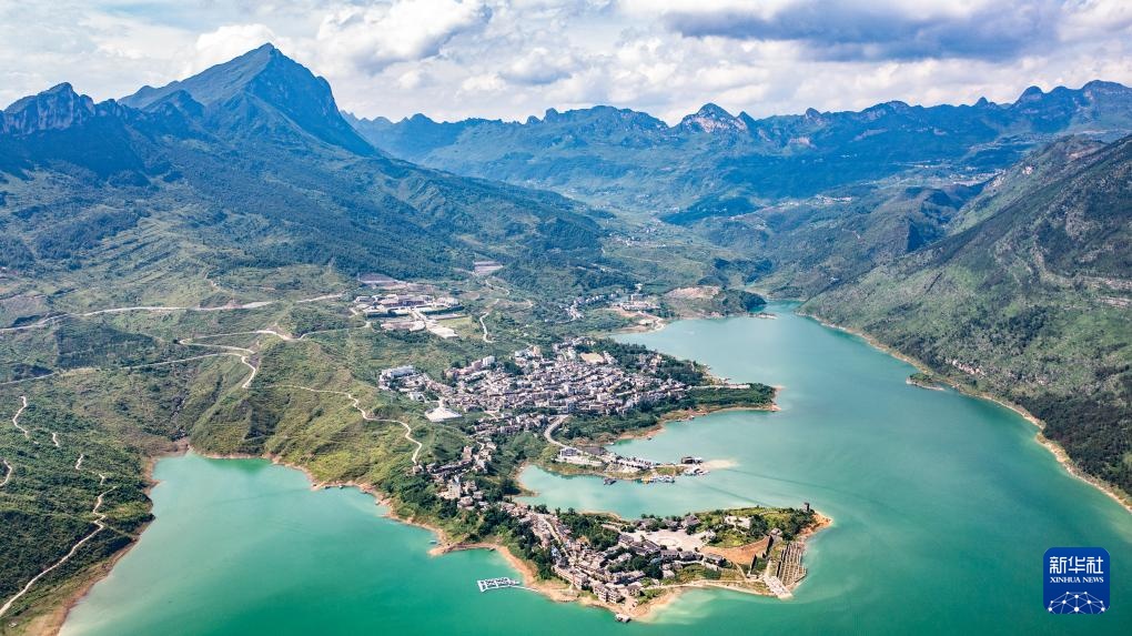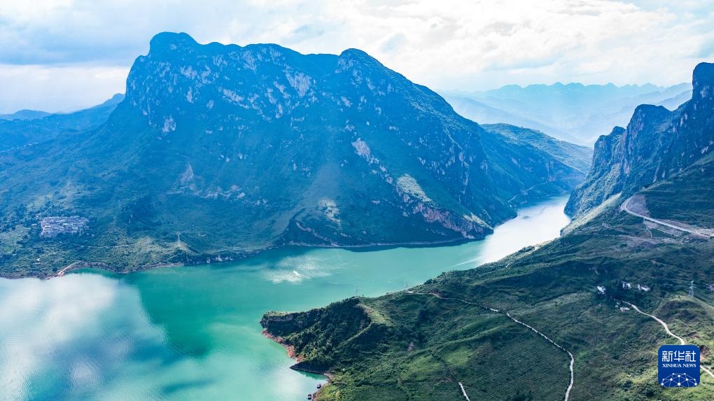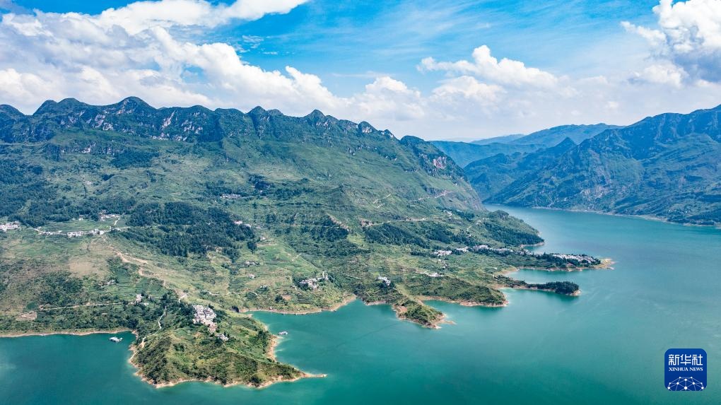 夏日时节,贵州省六盘水市六枝特区牂牁江风景名胜区草木植被郁郁葱葱,远山、江水、民居、道路构成一幅幅美丽的画卷。
