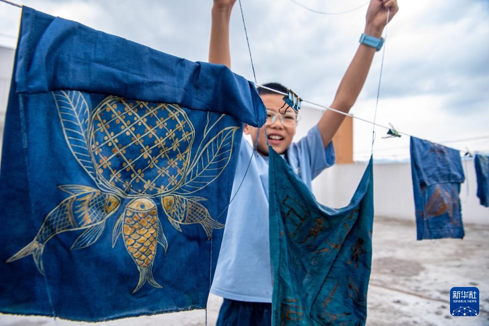 7月10日,在重庆市秀山县的非遗文创街蜡染馆内,小朋友晾晒染色的蜡染作品。