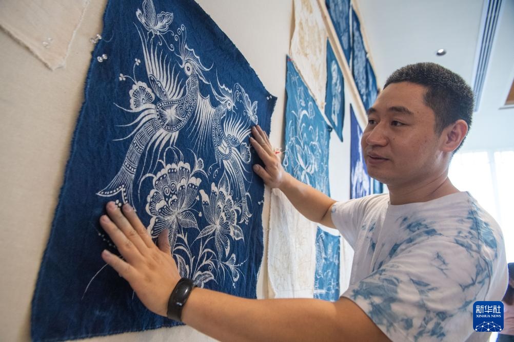 7月10日,在重庆市秀山县的非遗文创街蜡染馆内,蜡染传承人刘春林展示蜡染作品。