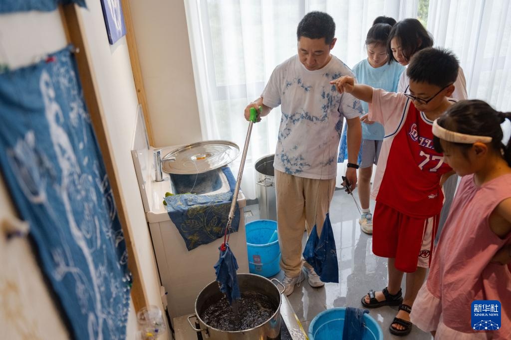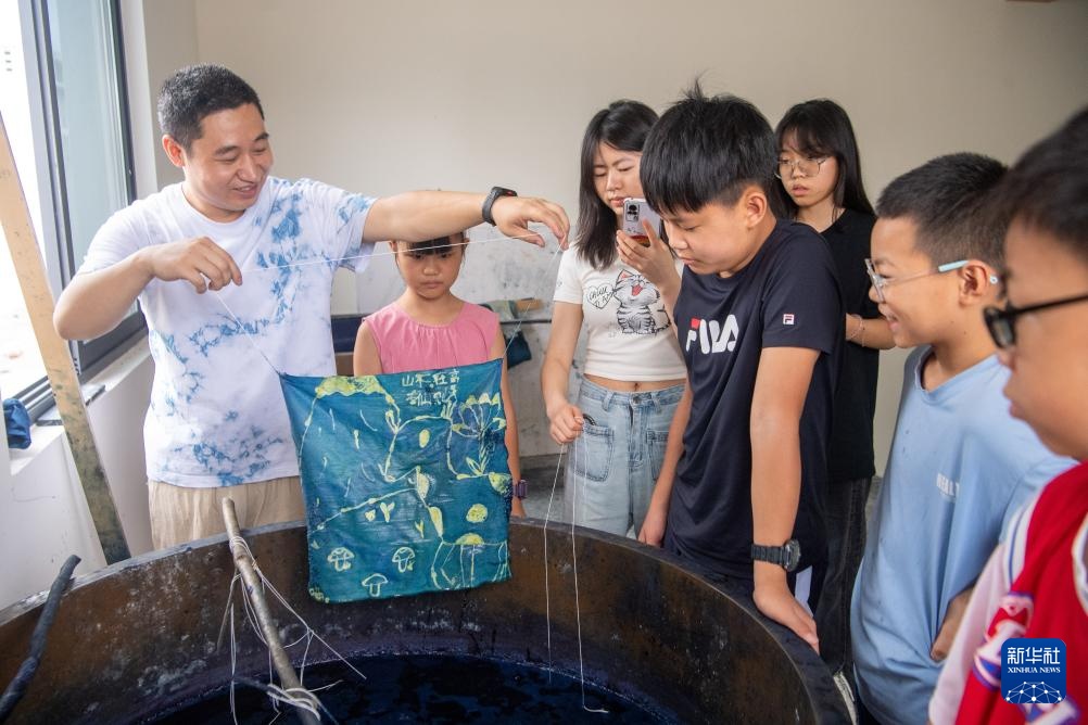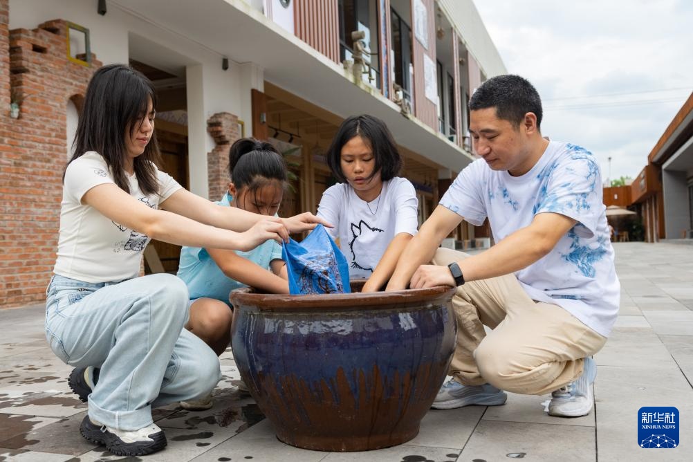 7月10日,在重庆市秀山县的非遗文创街蜡染馆内,蜡染传承人刘春林(左一)和青少年一起在对蜡染图案进行染色。