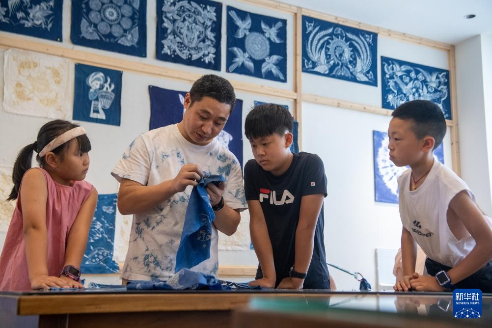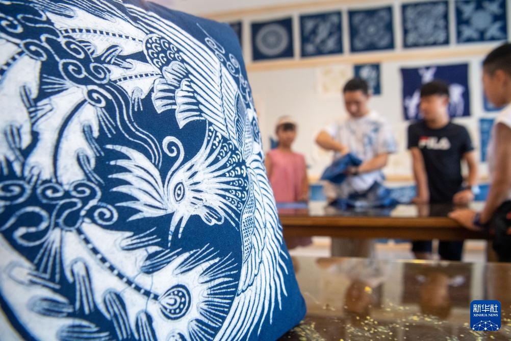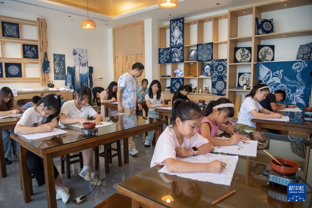 7月10日,在重庆市秀山县的非遗文创街蜡染馆内,青少年在蜡染传承人的指导下体验蜡染技艺。