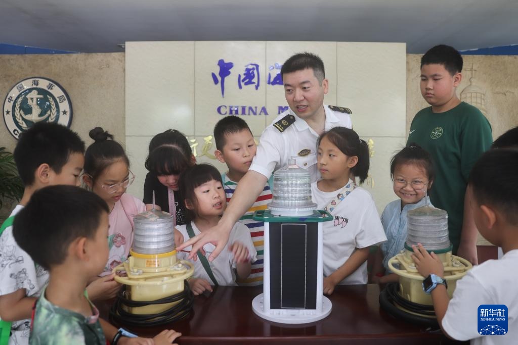 7月11日,“小候鸟”在宁波航标处参观装有北斗遥测信号的航标灯。