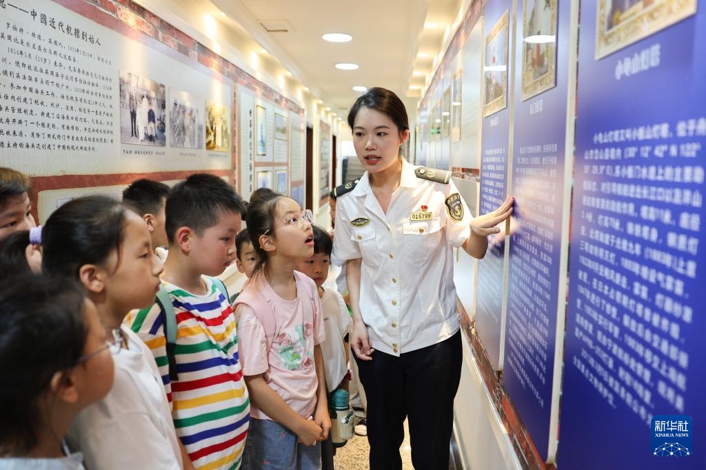 7月11日,“小候鸟”在宁波航标处航标文化走廊了解浙东沿海灯塔。