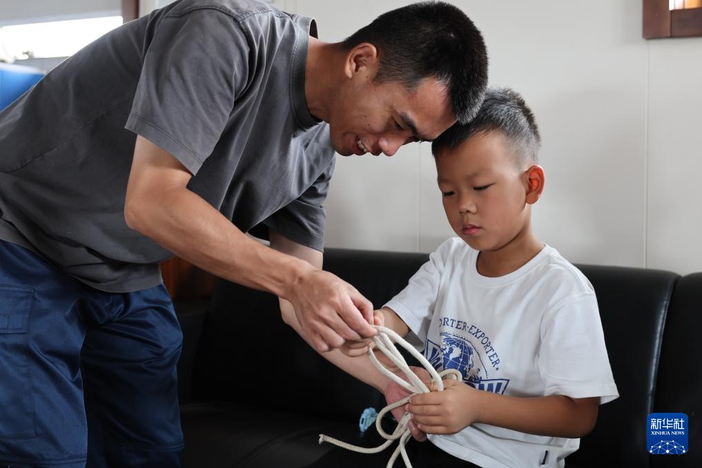 7月11日,小朋友在宁波航标处“海巡163”轮上学习“水手结”的打法。