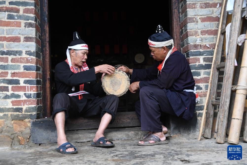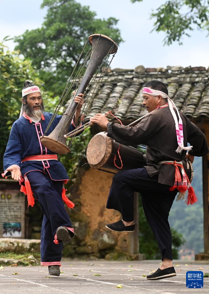 在广西金秀瑶族自治县六巷乡六巷村下古陈屯,黄泥鼓舞国家级非遗传承人盘金海(左)和金秀瑶族黄泥鼓制作技艺县级非遗传承人盘宁勇在跳黄泥鼓舞(7月10日摄)。