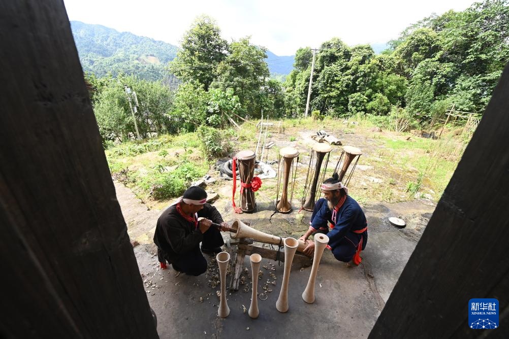 在广西金秀瑶族自治县六巷乡六巷村下古陈屯,黄泥鼓舞国家级非遗传承人盘金海(右)和金秀瑶族黄泥鼓制作技艺县级非遗传承人盘宁勇在制作黄泥鼓(7月10日摄)。