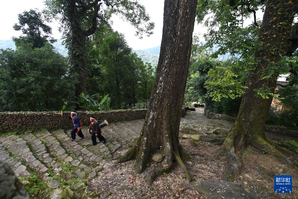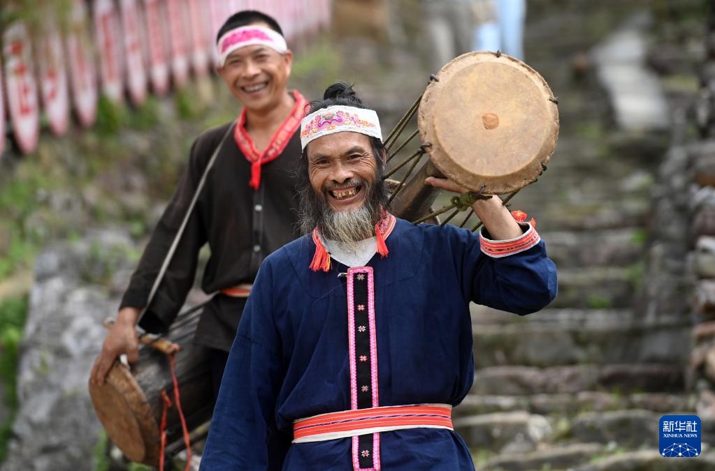 在广西金秀瑶族自治县六巷乡六巷村下古陈屯,黄泥鼓舞国家级非遗传承人盘金海(前)和金秀瑶族黄泥鼓制作技艺县级非遗传承人盘宁勇带着黄泥鼓去表演(7月10日摄)。