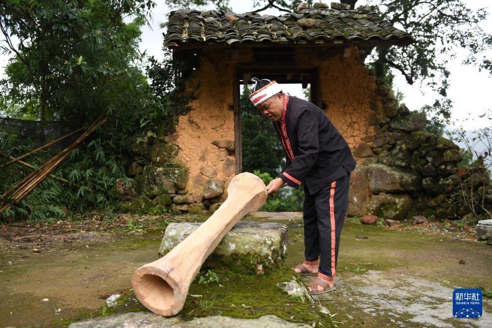 在广西金秀瑶族自治县六巷乡六巷村下古陈屯,金秀瑶族黄泥鼓制作技艺自治区级非遗传承人盘志明在制作黄泥鼓(2018年8月1日摄)。