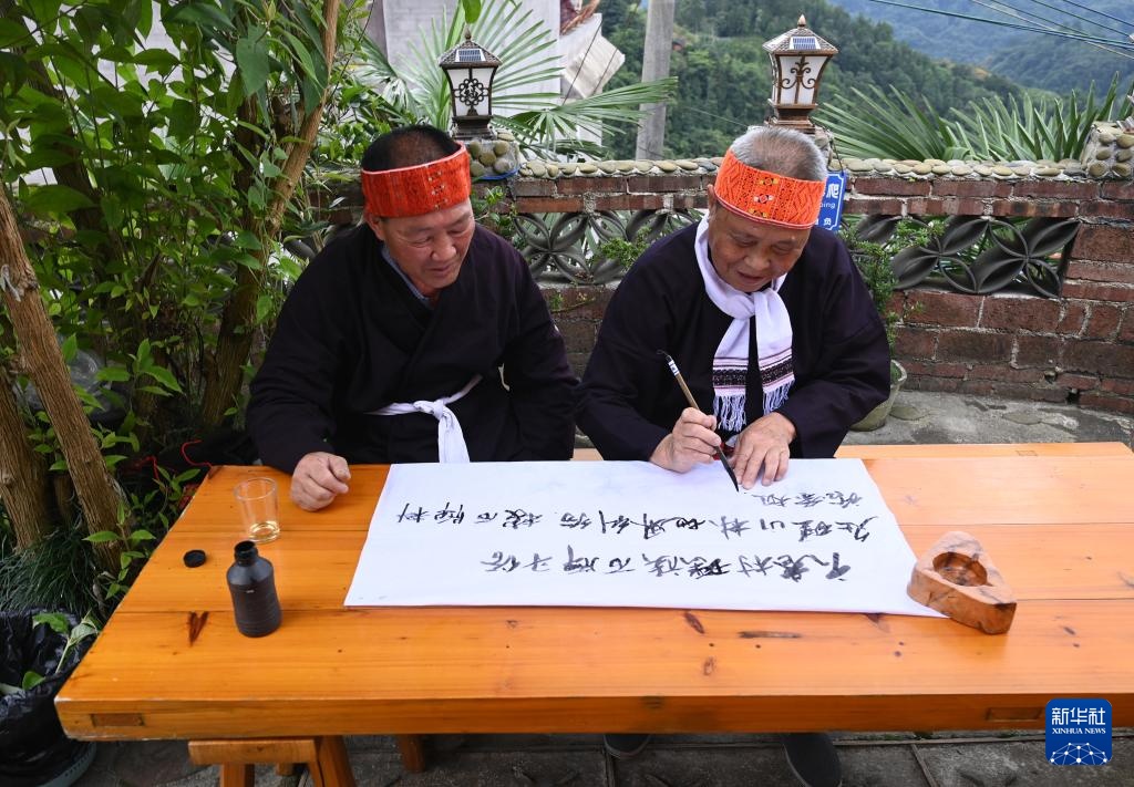 在广西金秀瑶族自治县六巷乡六巷村六巷屯,瑶族石牌习俗自治区级非遗传承人兰扶明(右)和蓝志生在书写瑶族石牌习俗料话记事榜。瑶族石牌习俗是国家级非物质文化遗产(7月10日摄)。