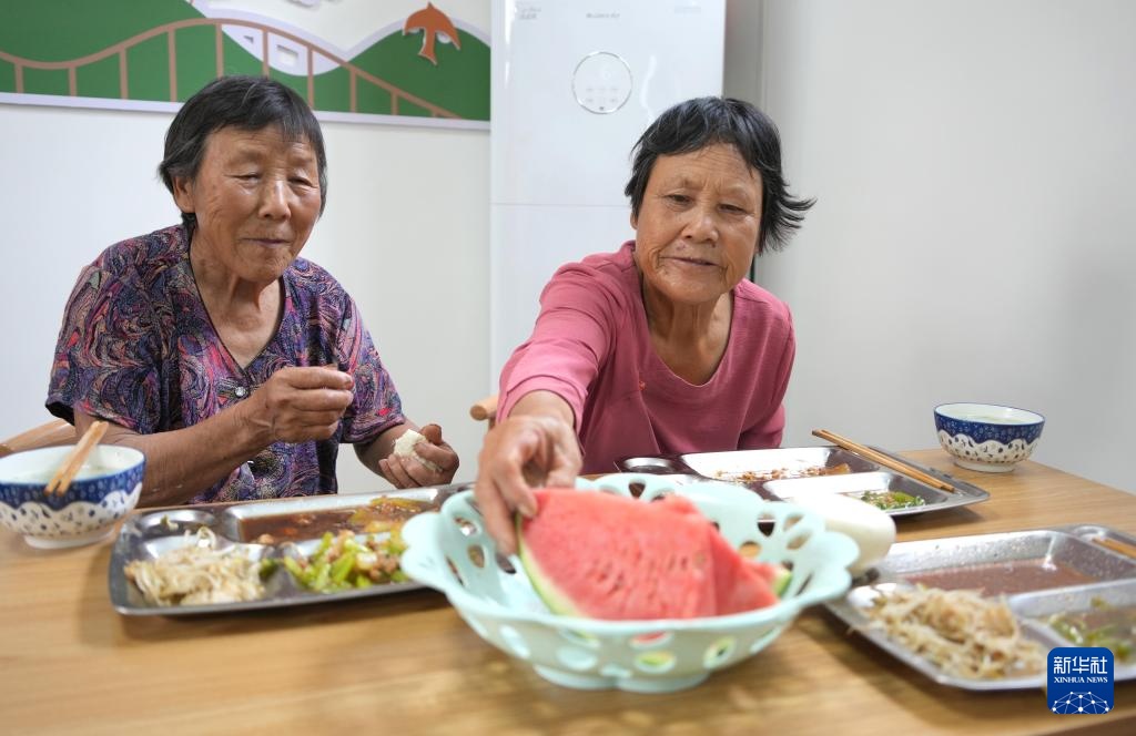 7月11日,在山东省枣庄市峄城区底阁镇望夫台村“爱心食堂”,两名老人在用餐时交谈。