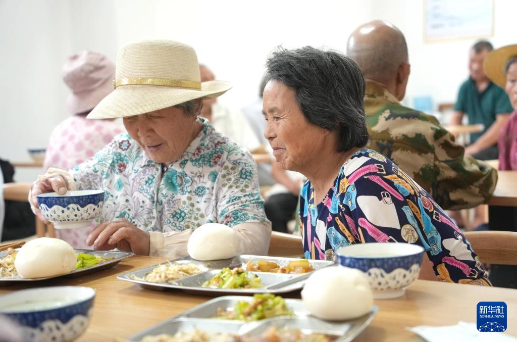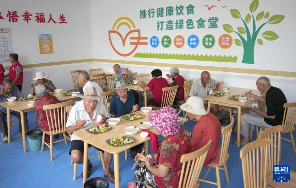 7月11日,在山东省枣庄市峄城区底阁镇魏楼村“爱心食堂”,老人们在用餐。