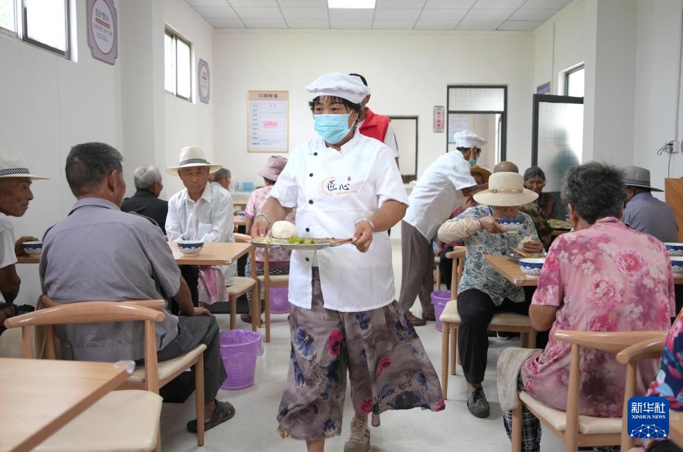 7月11日,在山东省枣庄市峄城区底阁镇望夫台村“爱心食堂”,工作人员在为老人送餐。