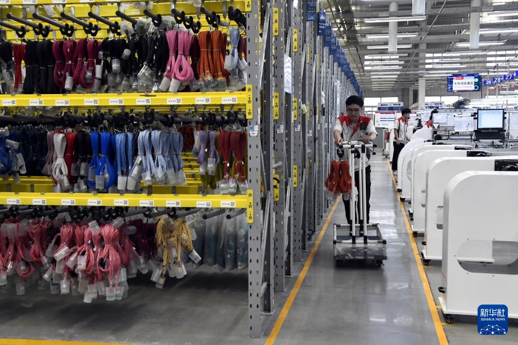 7月9日,在山东省乐陵市经济开发区曼德汽车零部件有限公司,工人在电子线束生产车间忙碌。
