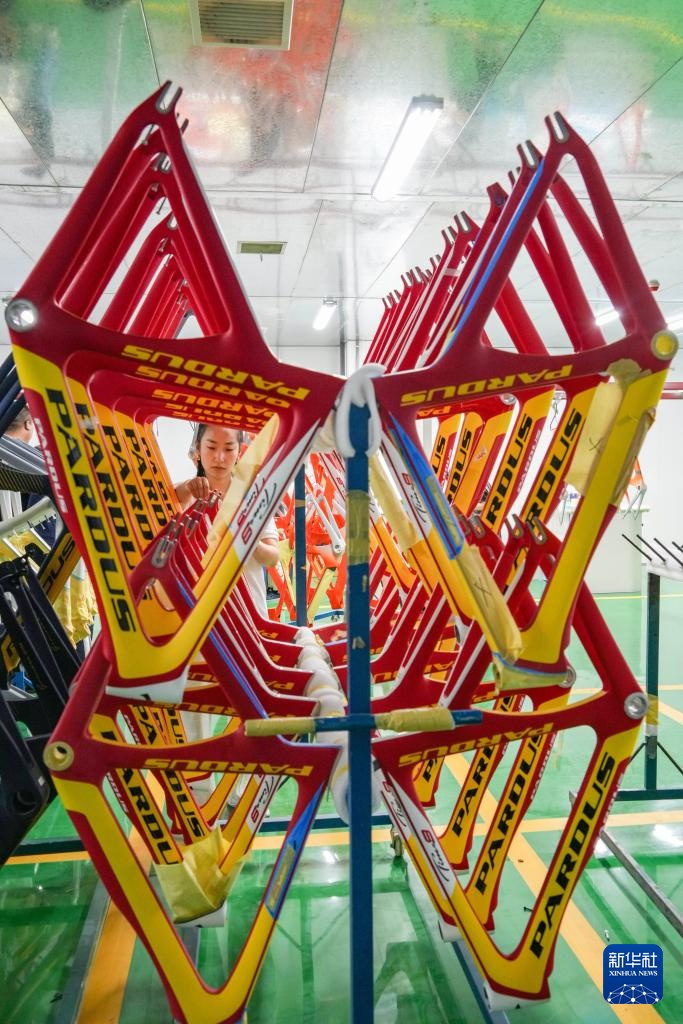 7月8日,在山东泰山瑞豹复合材料有限公司生产车间,工人在检测碳纤维自行车架。