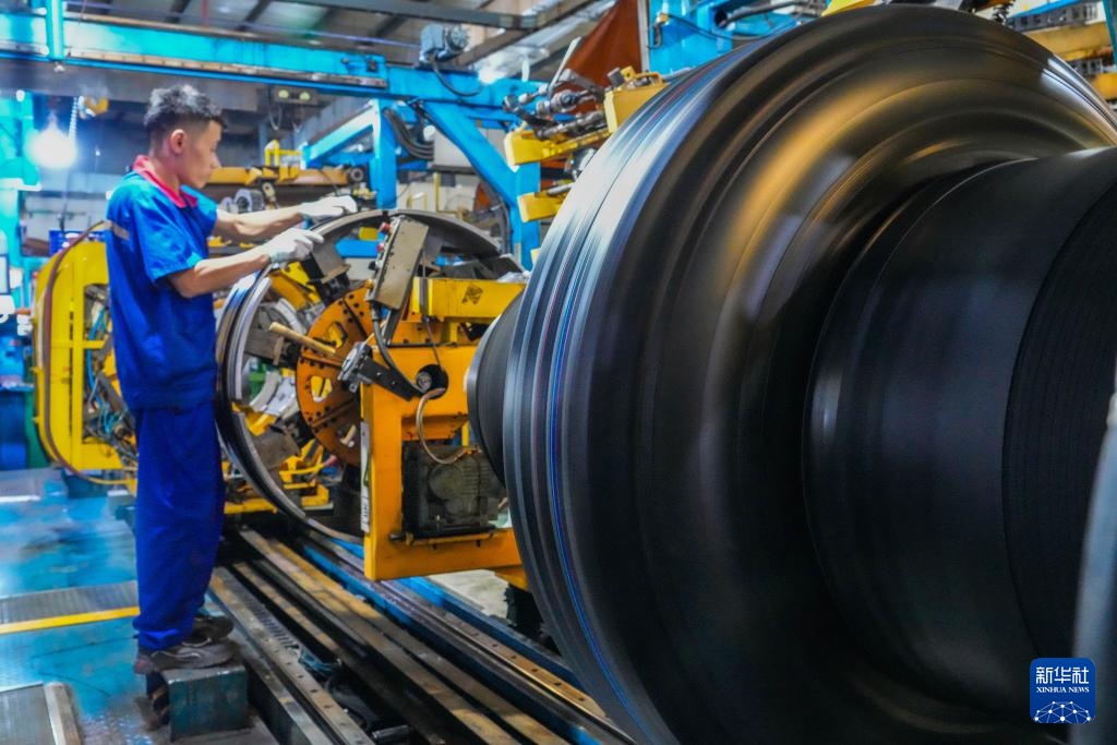 7月9日,在山东省乐陵市经济开发区启润轮胎有限公司,工人在载重子午轮胎成型车间忙碌。