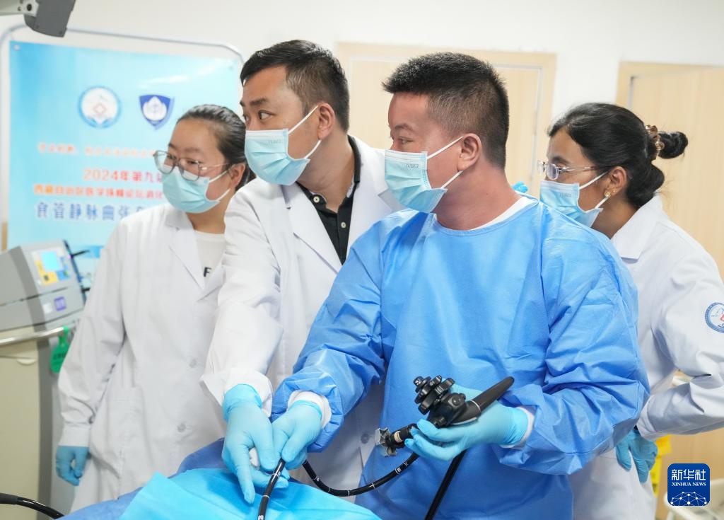 在日喀则市人民医院,胡健卫(左二)指导徒弟张武(左三)进行内镜手术(7月8日摄)。