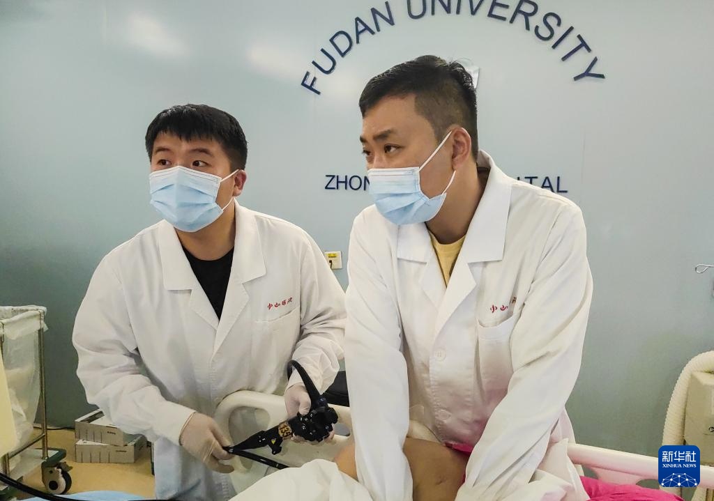 在复旦大学附属中山医院,段颖骞(左)在老师胡健卫的指导下进行内镜手术(6月26日摄)。