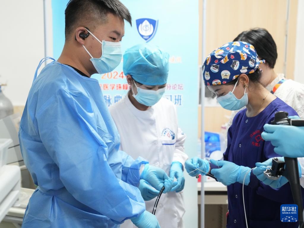 在日喀则市人民医院,段颖骞(左一)在进行内镜手术(7月8日摄)。
