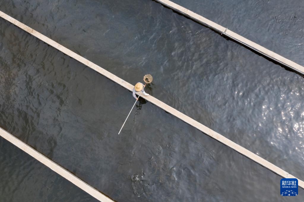 在位于沁水县张峰村的三文鱼养殖基地,工作人员准备将三文鱼分鱼池(7月10日摄)。