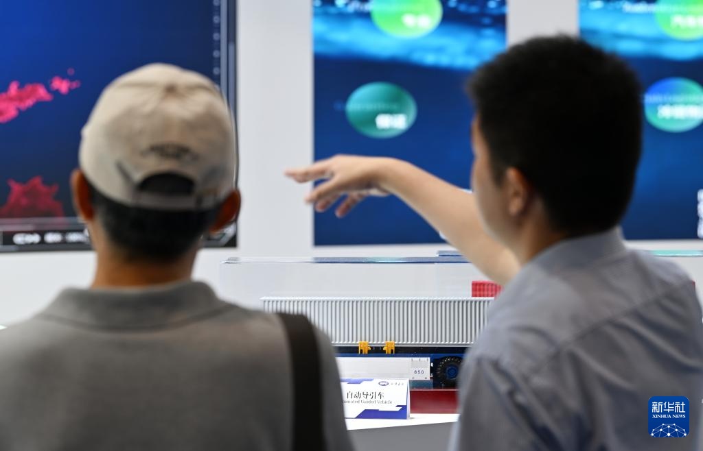 7月11日,与会者在博览会上了解自动导引车的应用情况。