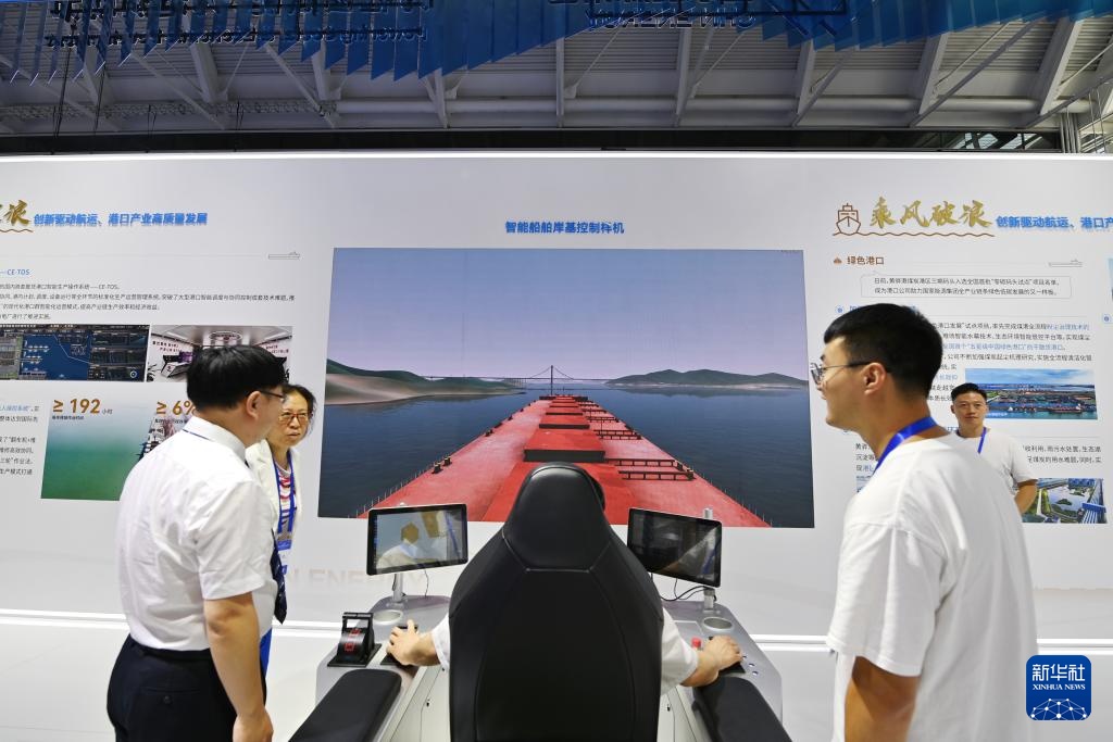 7月11日,与会者在博览会上体验船舶模拟驾驶。