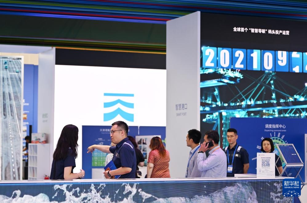 7月11日,与会者在博览会上的天津港展台参观。