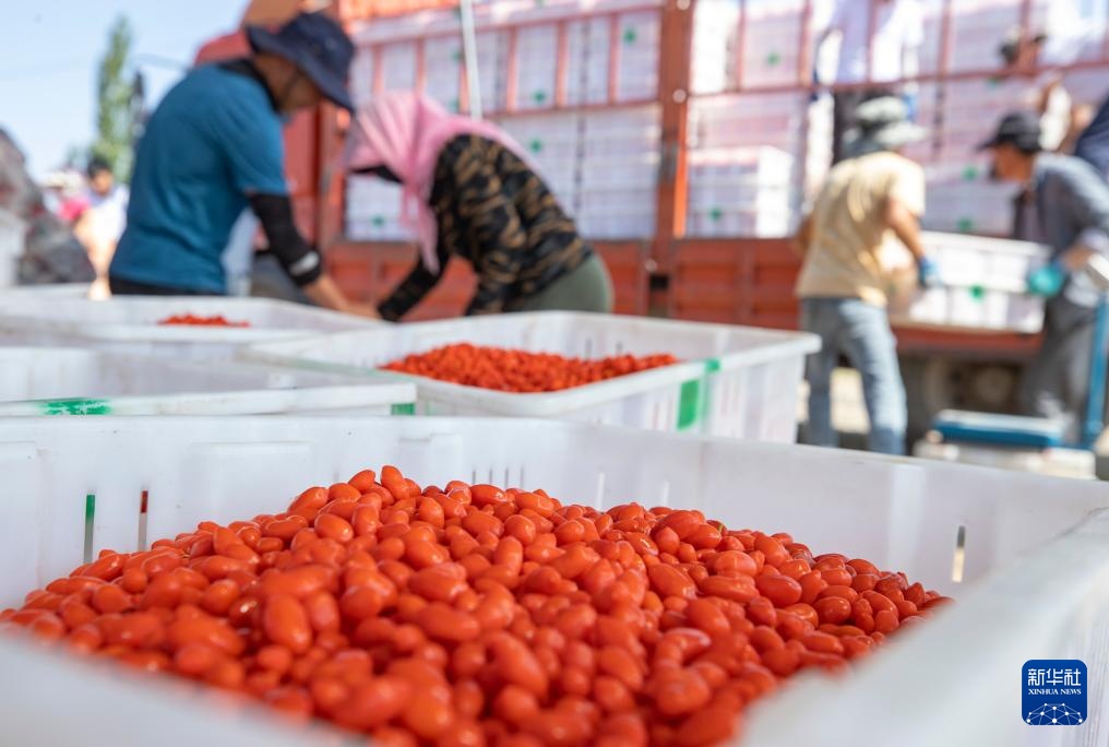 7月11日,在宁夏吴忠市同心县下马关镇五里墩村的枸杞生产基地,农户将采摘的枸杞装车。