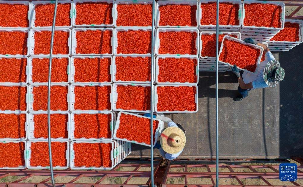 7月11日,在宁夏吴忠市同心县下马关镇五里墩村的枸杞生产基地,农户将采摘的枸杞装车(无人机照片)。