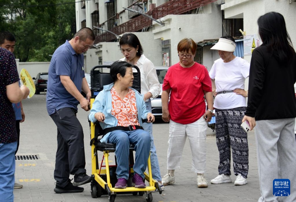 7月11日,朝阳区青年路社区一处老旧小区内的居民在体验和学习使用“爬楼机”。