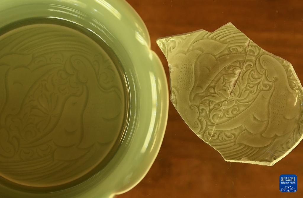 一片沙埠窑标志性的鹦鹉纹古瓷片(右)和谢振威烧制的鹦鹉纹洗(7月11日摄)。